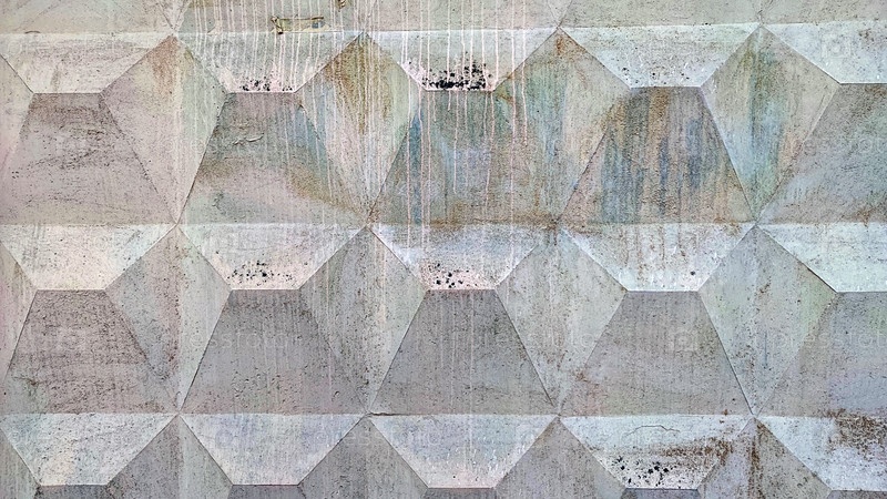 Часть бетонной текстурной стены забора. Грубая цементная поверхность, состоящая из квадратных повторяющихся фигур в виде прямоугольных пирамид. Поверхность светло-серая с подтеками от воды