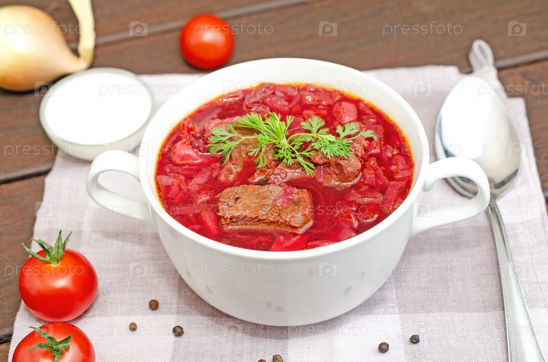 Борщовый суп с овощами и мясом на деревянном столе