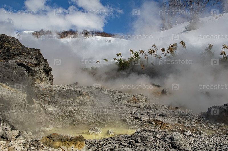 Россия. Курильские острова. Живописный плавучий термальный источник (Кипящая река) возле вулкана Барановского на острове Итуруп, температура воды которого у истока достигает 80 градусов
