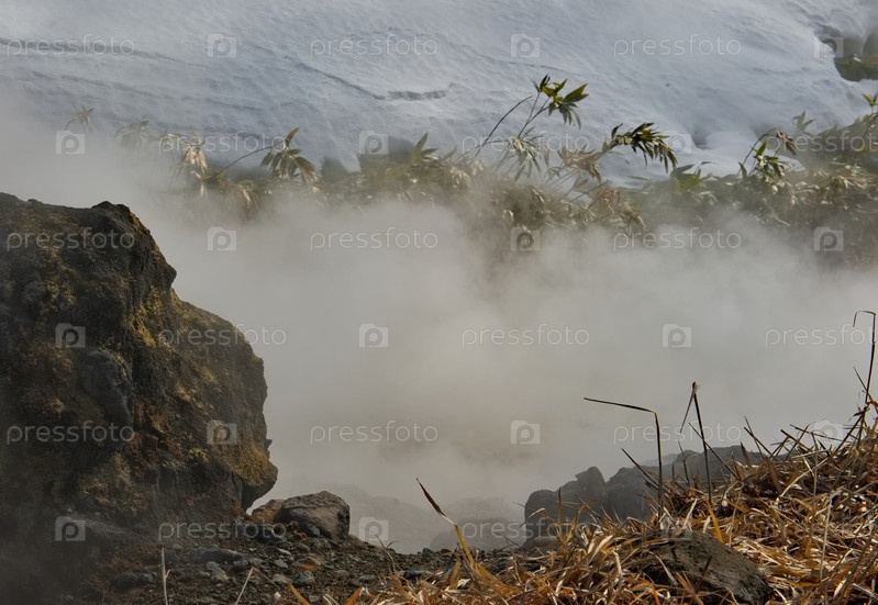 Россия. Курильские острова. Живописный плавучий термальный источник (Кипящая река) возле вулкана Барановского на острове Итуруп, температура воды которого у истока достигает 80 градусов