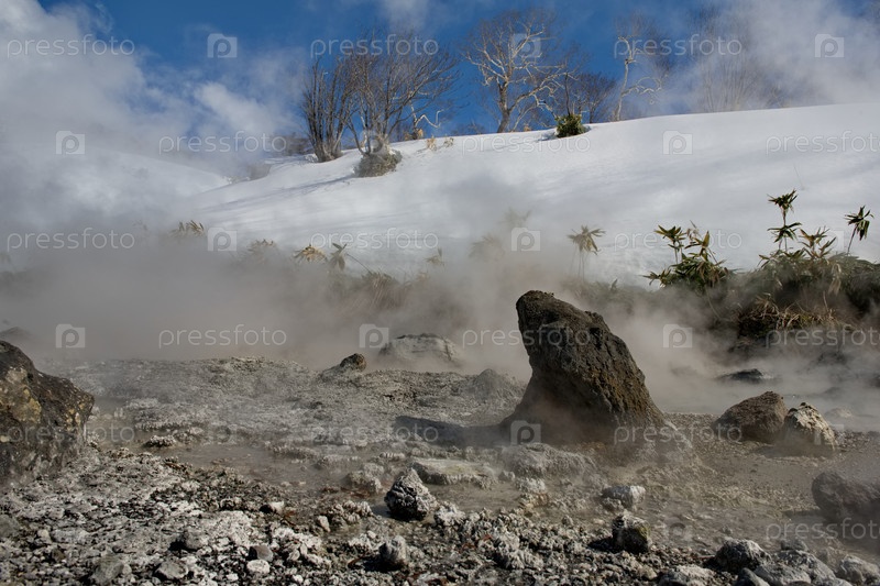 Россия. Курильские острова. Живописный плавучий термальный источник (Кипящая река) возле вулкана Барановского на острове Итуруп, температура воды которого у истока достигает 80 градусов