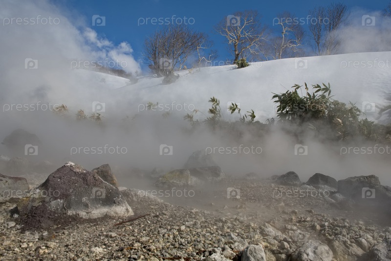 Россия. Курильские острова. Живописный плавучий термальный источник (Кипящая река) возле вулкана Барановского на острове Итуруп, температура воды которого у истока достигает 80 градусов