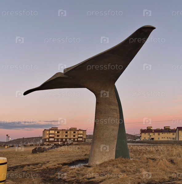 Китовый. Россия. 18 марта 2023 года. Вид на памятник в виде ныряющего в глубины океана китового хвоста, который установлен на берегу Охотского моря в поселке Китовый