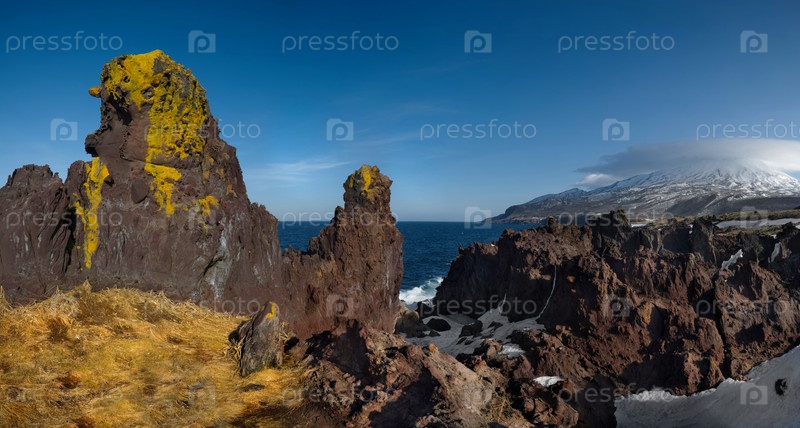 Россия. Дальний Восток, Курильские острова. Очень твердые и острые базальтовые скалы вдоль побережья Охотского моря на острове Итуруп