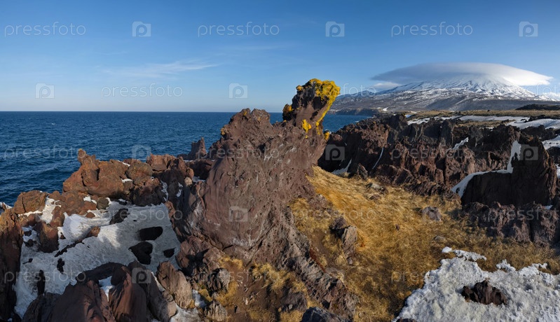 Россия. Дальний Восток, Курильские острова. Очень твердые и острые базальтовые скалы вдоль побережья Охотского моря на острове Итуруп
