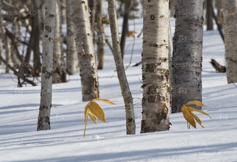 Россия. Курильские острова. Засохшие желтые листья курильской сазы (бамбука) контрастируют с ветром на фоне белого снега между корявыми каменными березами
