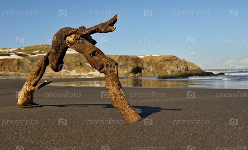 Россия. Дальний Восток, Курильские острова. Природный ландшафт с причудливой корягой на прибрежном вулканическом песке Тихого океана