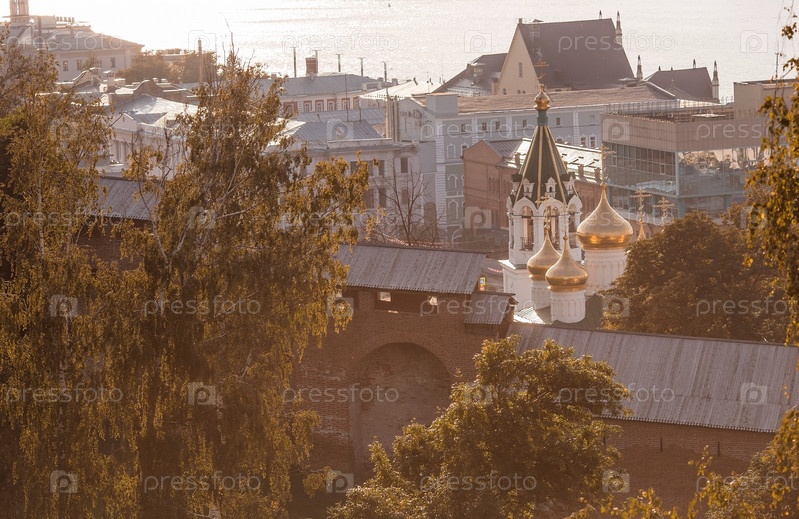 Нижегородский кремль и церковь Рождества Иоанна Предтечи. Вид со смотровой площадки. Россия. Нижний Новгород, август 2023 г