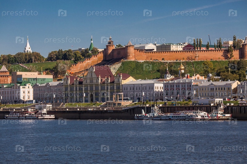 Прекрасный вид на Нижний Новгород с реки Волги в солнечный летний день. Россия, Нижний Новгород, август 2023 г