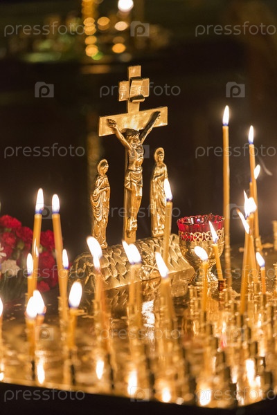 Россия. Санкт-Петербург. Церковная православная атрибутика. Крест и горящие свечи, лампада. Парафералия Православной церкви. Крест с горящими свечами, светильник