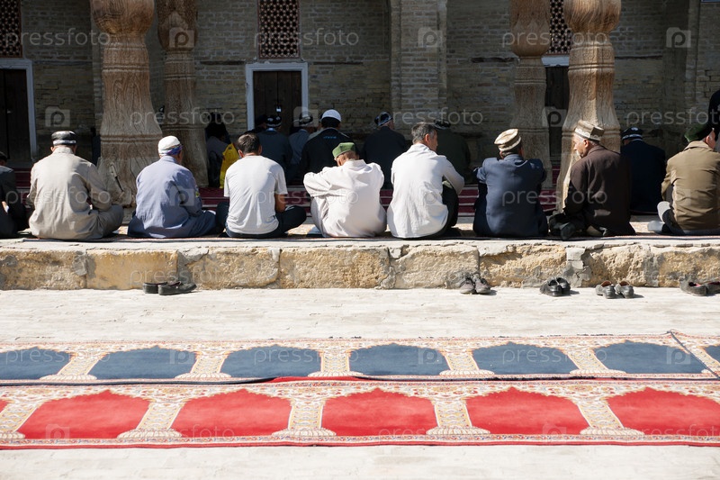 Узбекистан. Бухара. Мусульмане молятся. Молитва мусульман у мечети Узбекистана. Бухара