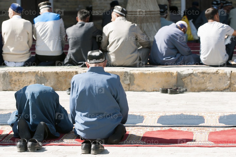 Узбекистан. Бухара. Мусульмане молятся. Молитва мусульман у мечети Узбекистана. Бухара