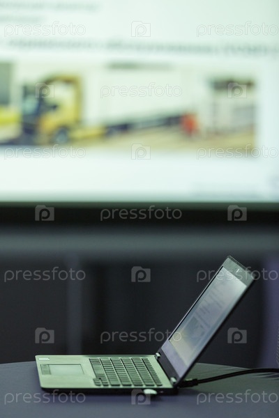 Россия. Санкт-Петербург. Ноутбук на столе. Показ презентации на собрании. Россия. Санкт-Петербург. Ноутбук находится на столе. Показывая презентацию на совещании