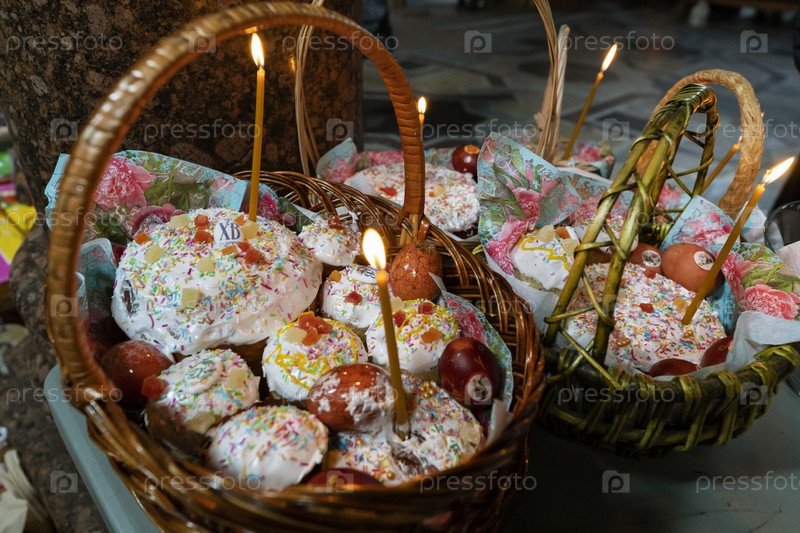 Россия. Санкт-Петербург. Религиозное празднование Пасхи. Освящение кустов в церкви. Россия. Санкт-Петербург. Религиозный праздник Воскресения. Посвящение тортов в церкви