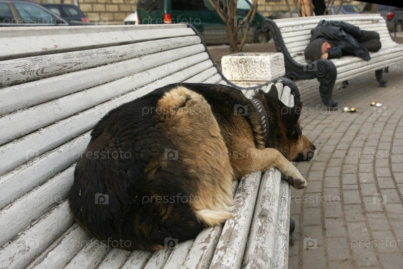 Россия.Санкт-Петербург.Собака лежит на скамейке.Бесдомный спит на улице.Россия.Санкт-Петербург.Собака лежит на лавочке.Бездомный человек спит на улице