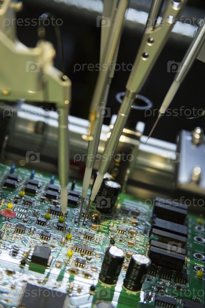 Россия. Санкт-Петербург. Производство радиоэлектроники. Летящие носороги тестируют печатную плату с микросхемами. Россия. Санкт-Петербург. Производство радиоэлектроники. Летающие зонды испытывают печатные схемы с помощью микрочипов
