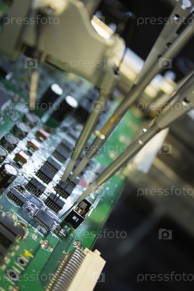 Россия. Санкт-Петербург. Производство радиоэлектроники. Летящие носороги тестируют печатную плату с микросхемами. Россия. Санкт-Петербург. Производство радиоэлектроники. Летающие зонды испытывают печатные схемы с помощью микрочипов