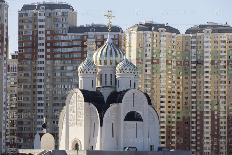 Россия. Москва. Никольский храм. Православная церковь на фоне жилых домов на набережной Живописная. Россия. Москва. Церковь Святого Николая. Православная церковь на фоне жилых зданий на набережной is Picturesque