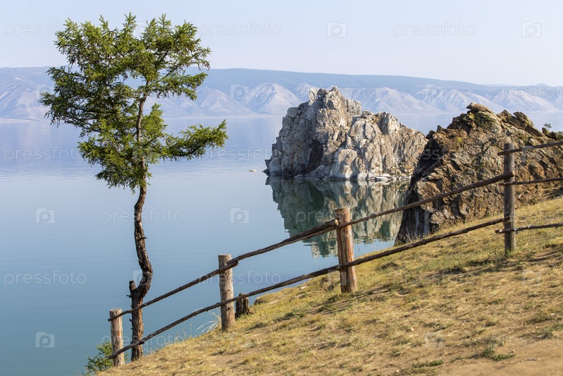 Россия. Ольхон, Хужир. Виды острова Ольхон и озера Байкал. Скала Шаманка на мысе Бурхан. Виды острова Ольхон и озера Байкал. Скала Шаманка на мысе Бурхан