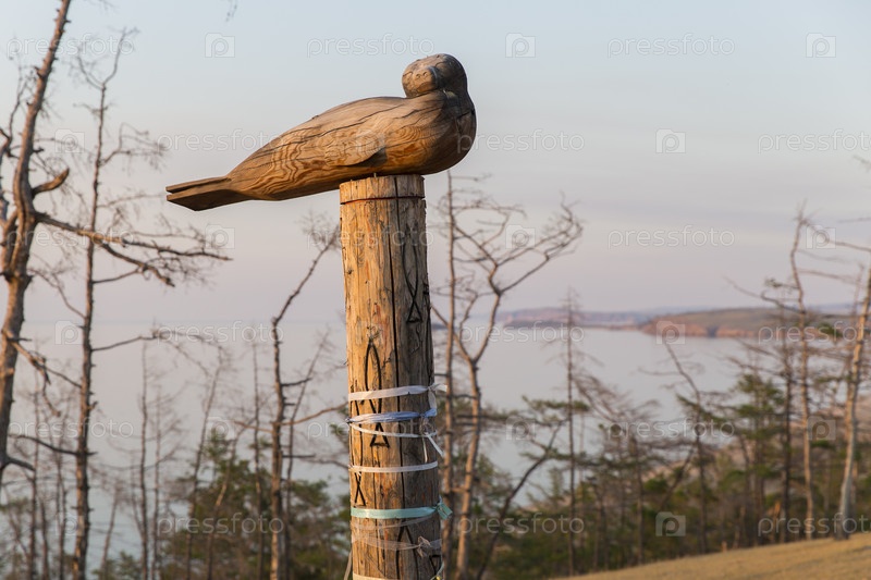 Россия. Ольхон, Хужир. Виды острова Ольхон. Деревянная фигура тюленя на озере Байкал