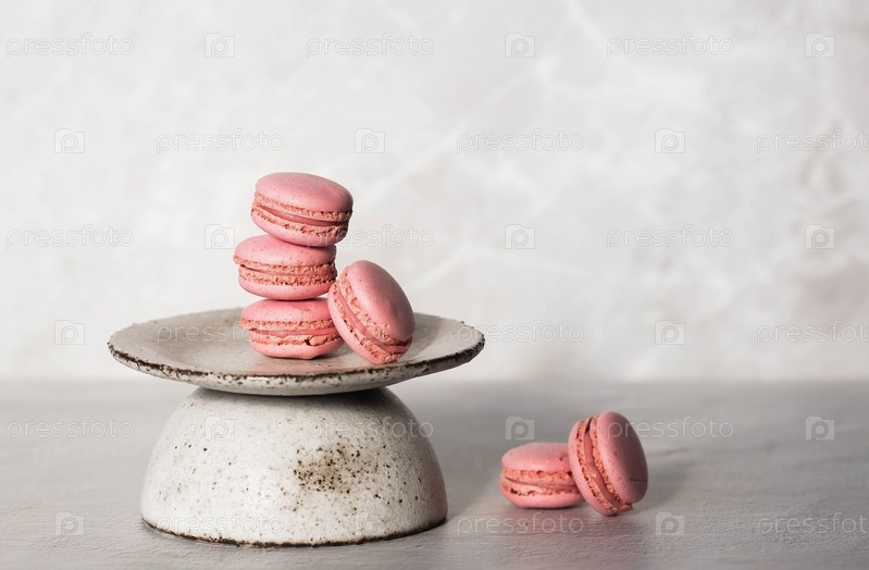 Традиционные французские макароны. Розовое миндальное печенье на стильной керамической тарелке на сером каменном фоне. Вкусный десерт