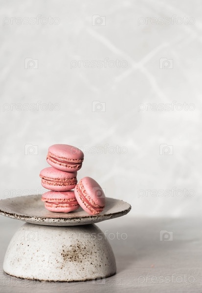 Традиционные французские макароны. Розовое миндальное печенье на стильной керамической тарелке на сером каменном фоне. Вкусный десерт