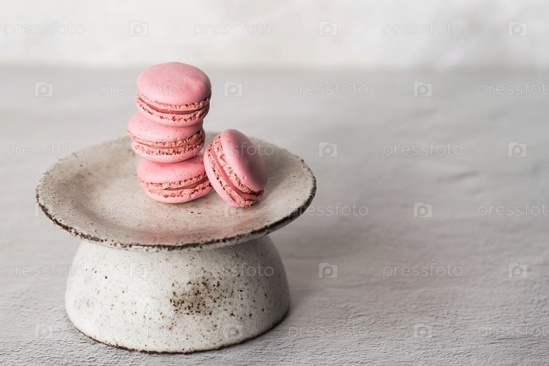 Традиционные французские макароны. Розовое миндальное печенье на стильной керамической тарелке на сером каменном фоне. Вкусный десерт