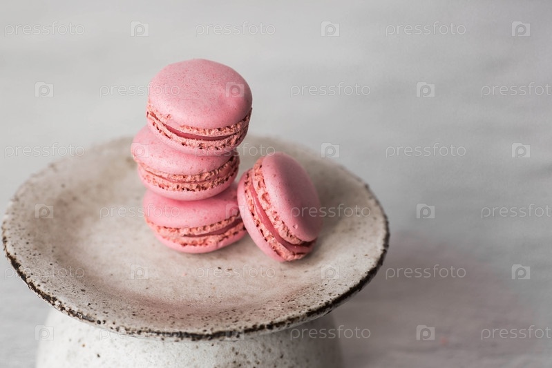 Традиционные французские макароны. Розовое миндальное печенье на стильной керамической тарелке на сером каменном фоне. Вкусный десерт