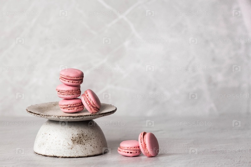 Традиционные французские макароны. Розовое миндальное печенье на стильной керамической тарелке на сером каменном фоне. Вкусный десерт