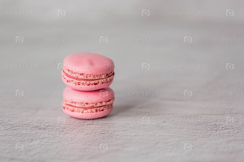 Традиционные французские макароны. Розовые макароны на сером каменном фоне. Вкусный десерт