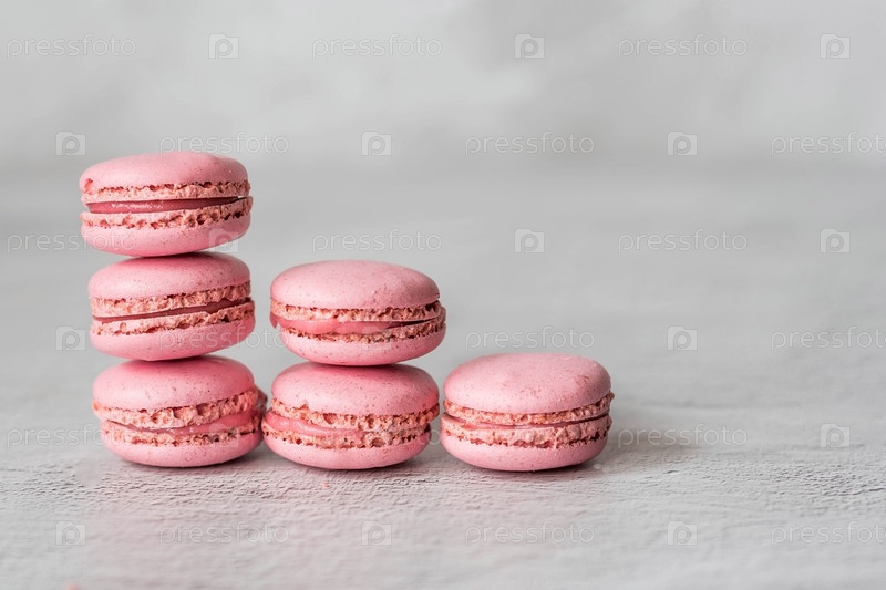 Традиционные французские макароны. Розовые макароны на сером каменном фоне. Вкусный десерт