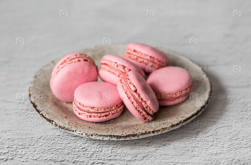 Традиционные французские макароны. Розовое миндальное печенье на стильной керамической тарелке на сером каменном фоне. Вкусный десерт