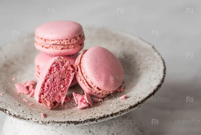Традиционные французские макароны. Розовое миндальное печенье на стильной керамической тарелке на сером каменном фоне. Вкусный десерт