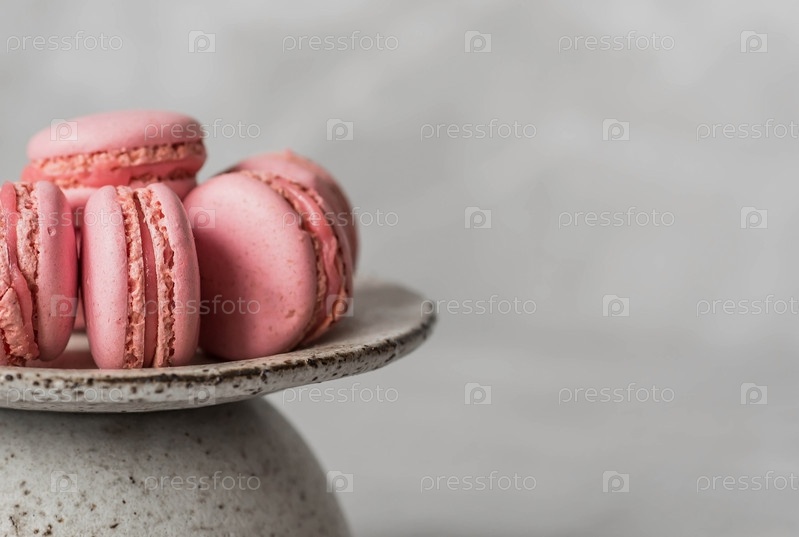 Традиционные французские макароны. Розовое миндальное печенье на стильной керамической тарелке на сером каменном фоне. Вкусный десерт