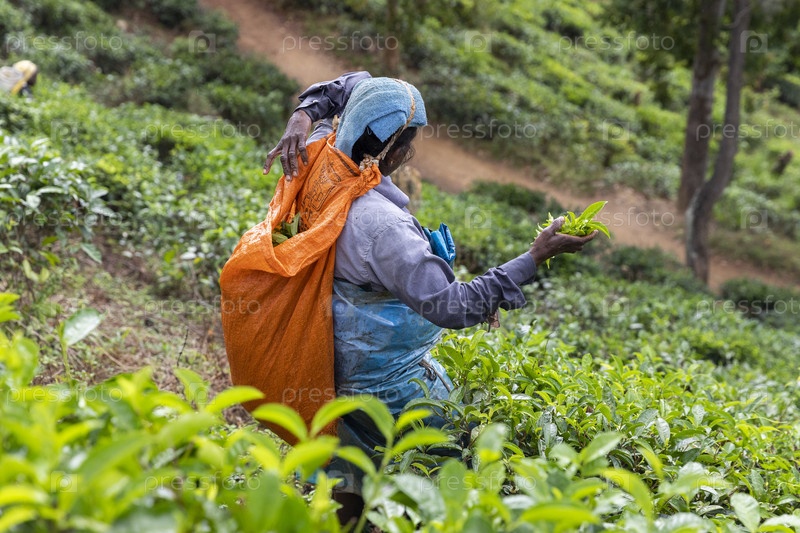 Шри-Ланка. Элла. Сбор листьев чайных кустарников на чайной плантации. Шри-Ланка. Элла. Сбор листьев кустов на чайной плантации