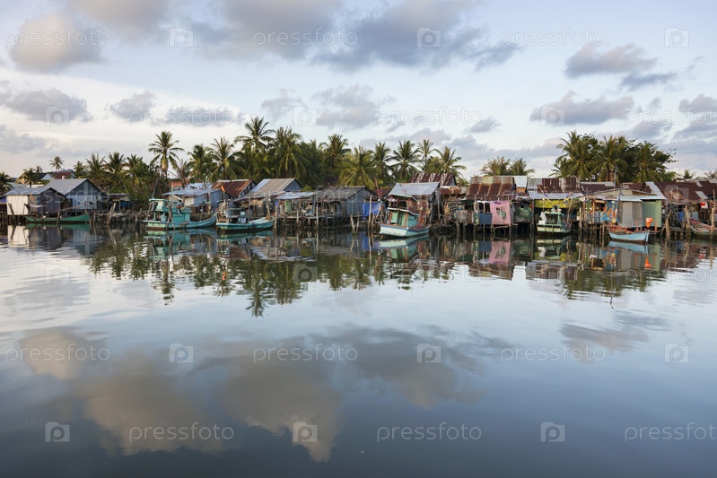 Вьетнам. Дуонг Донг, остров Фукуок. Вьетнамская деревня. Вьетнамские дома отражаются в реке. Вьетнам. Дюонг Донг, остров Пху Куок. Вьетнамская деревня. Вьетнамские дома отражены в реке