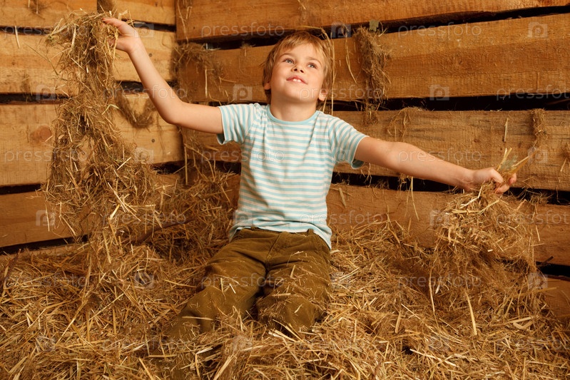 Портрет мальчика, играющего в куче соломы на сеновале