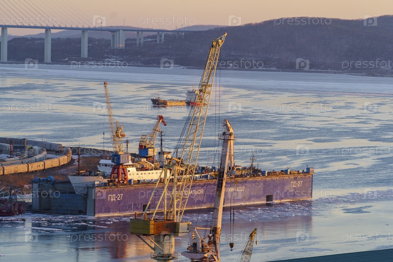 Морской пейзаж с видом на плавучий док в заливе Диомида. Владивосток