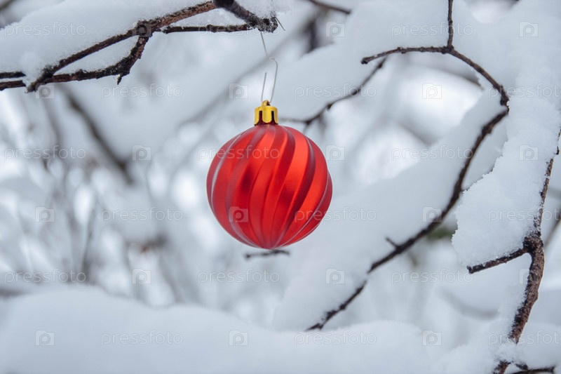 Красный, гофрированный рождественский шар, висящий на ветвях, покрытых белым снегом зимой, крупный план с пустым местом для текста, концепция поздравительной открытки