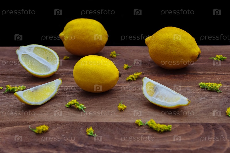 Желтые лимоны целые и разрезанные на ломтики и пополам на коричневом деревянном кухонном столе с разбросанными полевыми цветами на темном фоне