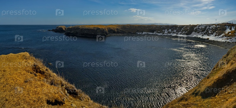 Россия. Курильские острова. Панорама высокого крутого побережья Охотского моря на острове Итуруп у подножия заснеженных вулканов