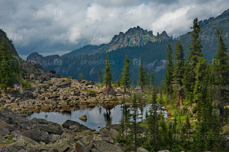 Россия. Юг Сибири. Западный Саян. Панорамный вид на высокогорное озеро, окруженное суровыми скалами, с горного перевала в природном горном парке Ергаки