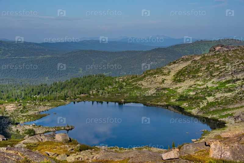 Россия. Юг Сибири. Западный Саян. Панорамный вид на высокогорное озеро, окруженное суровыми скалами, с горного перевала в природном горном парке Ергаки
