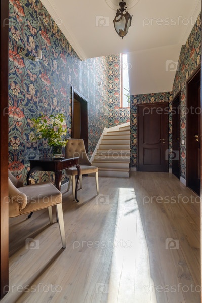 Журнальный столик с букетом и чашкой, стоящий возле лестницы на второй этаж