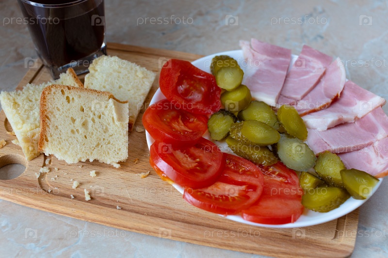 Ветчина и нарезанные овощи с хлебом на тарелке