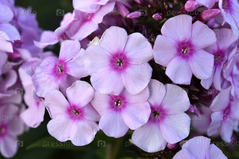 Розовые цветы флокса на зеленом кусте. Маленькие светло-розовые цветки флокса. Большие цветы