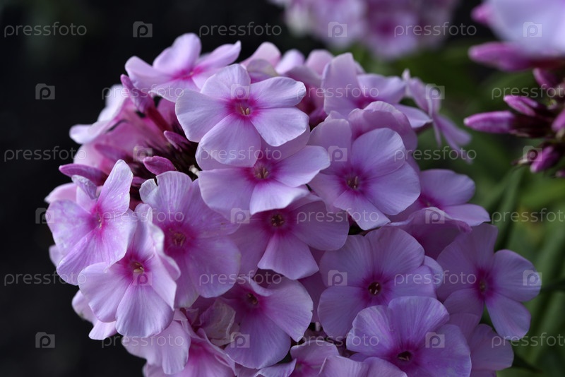 Розовые цветы флокса на зеленом кусте. Маленькие светло-розовые цветки флокса. Большие цветы