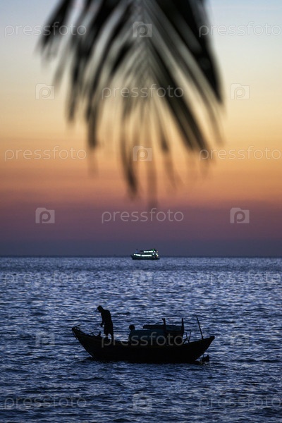 Вьетнам. Фукуок. Рыбалка. Рыбак на лодке ловит рыбу сеткой. Вьетнам. Пху-Куоц. Рыбалка. Рыбак на лодке, чтобы поймать рыбу с помощью сети