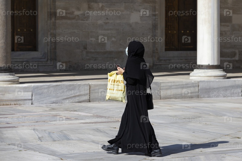 Турция. Стамбул. Исламские традиции. Мусульманка в паранже во дворе мечети. Турция. Стамбул. Исламские традиции. Мусульманка в бурке во дворе мечети