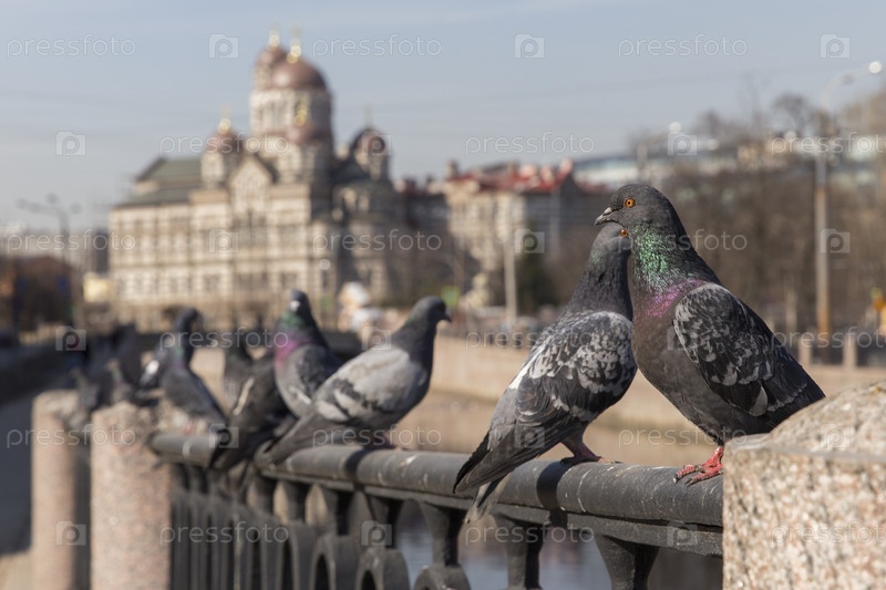 Россия. Санкт-Петербург. Виды на Петербург. Голуби сидят на набережной реки Карповка. Россия. Санкт-Петербург. Виды на Санкт-Петербург. Голуби сидят на набережной реки Карповка